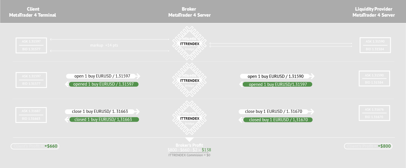 As a result if the client gets profit at broker, the broker receives profit on the liquidity provider's account but more than 14 points due to expanded markup.